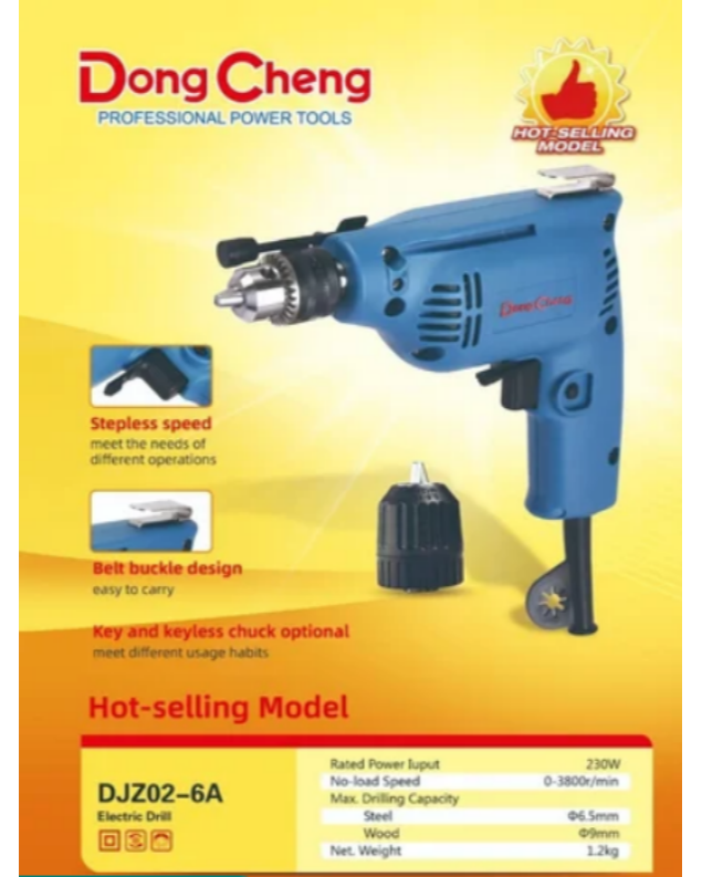 Dongcheng DJZ02-6A Electric Drill – Compact & Powerful 230W Drilling Machine The Dongcheng DJZ02-6A Electric Drill is a reliable and versatile corded electric drill machine designed for both home users and professionals who need a lightweight yet powerful tool for everyday drilling tasks. Whether you’re installing shelves, fixing furniture, or working on light construction jobs, this Dongcheng drill delivers dependable performance with precision and ease. Powered by a 230 W high-quality motor, the DJZ02-6A offers smooth and stable drilling across a range of materials including steel, wood, plastic, and metal sheets. With a no-load speed of up to ~3800 rpm, you get consistent drilling speed and control for clean, accurate holes every time.