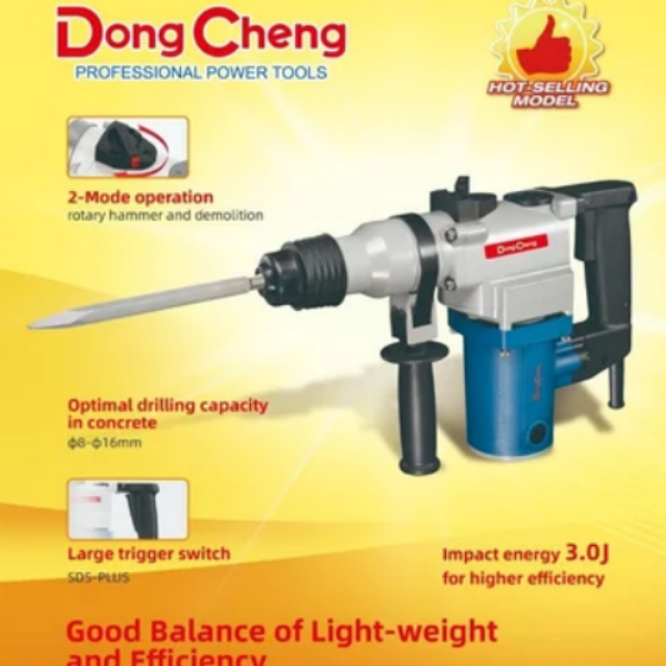 Dongcheng Electric Rotary Hammer DZC03-26B The Dongcheng Electric Rotary Hammer DZC03-26B is a reliable and high-performance power tool designed for drilling and hammer drilling in concrete, brick, stone, and masonry surfaces. Built for professional contractors, electricians, plumbers, and serious DIY users, this rotary hammer delivers consistent power, durability, and efficiency for daily construction tasks. Powered by a 750W high-efficiency motor, the Dongcheng DZC03-26B provides strong impact force and stable speed, ensuring smooth and fast drilling even in hard materials. With a maximum drilling capacity of 26 mm in concrete, it is ideal for anchor fixing, electrical conduit installation, plumbing work, and renovation projects. The rotary hammer is equipped with an SDS-Plus chuck system, allowing quick, tool-free bit changes and secure bit locking. This feature improves productivity and reduces downtime on busy job sites. The dual-mode operation—rotary drilling and hammer drilling—offers flexibility to handle different applications with ease. Designed for user comfort and safety, the DZC03-26B features an ergonomic grip, auxiliary side handle, and depth gauge, providing better control, accuracy, and reduced operator fatigue during extended use. Its robust housing and dust-resistant internal components ensure a longer service life even under tough working conditions.